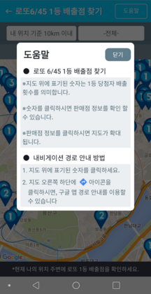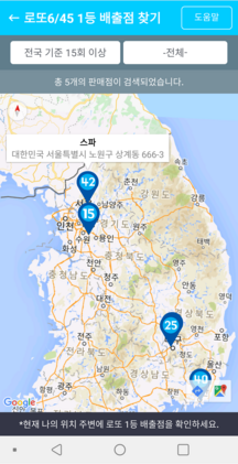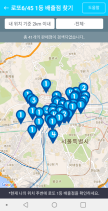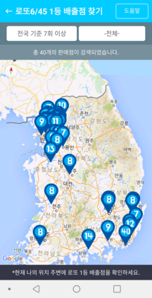 전국 로또 명당을 현재 나의 위치 기준으로 지도에 표기하여 알려주는 앱이 있습니다.