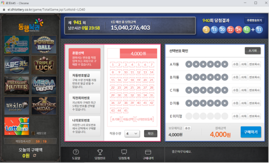 복권구매 메뉴를 누른 후 로또 6/45를 선택하면 구매할 수 있는 팝업창이 나타납니다.