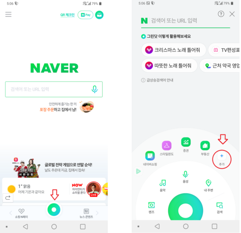 1. 네이버 앱을 실행합니다. 하단에 동그라미 아이콘을 클릭합니다.