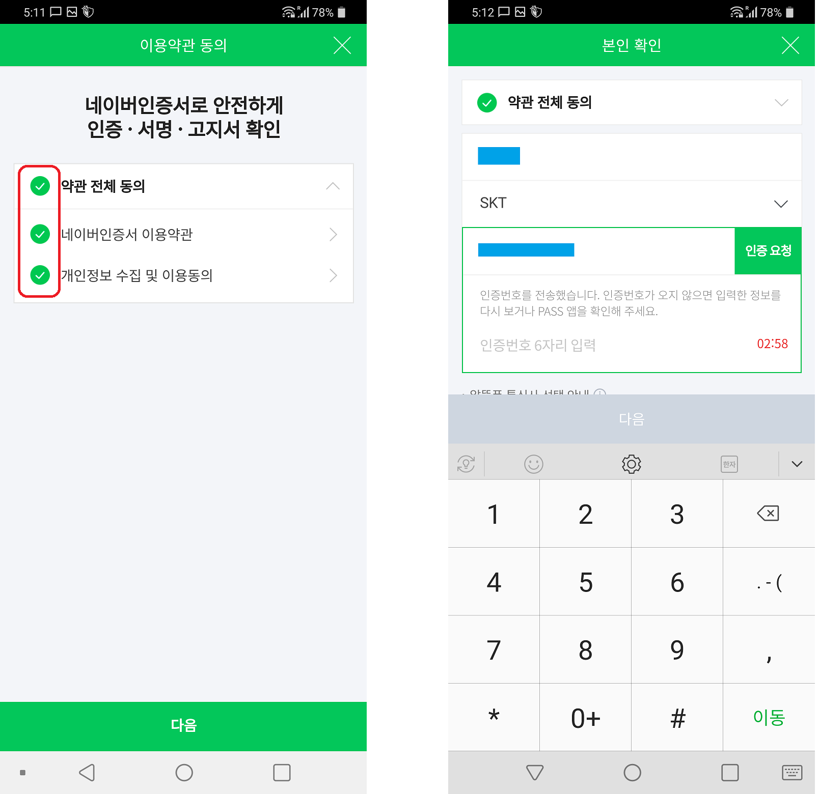 7. 네이버인증서 이용약관 및 개인정보 수집 및 이용동의에 대한 이용약관 동의 후 다음 버튼을 클릭합니다.
