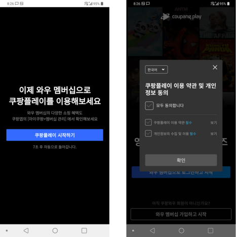 5.쿠팡플레이 이용 약관 및 개인 정보 동의에 모두 체크 후 확인 버튼을 클릭합니다.