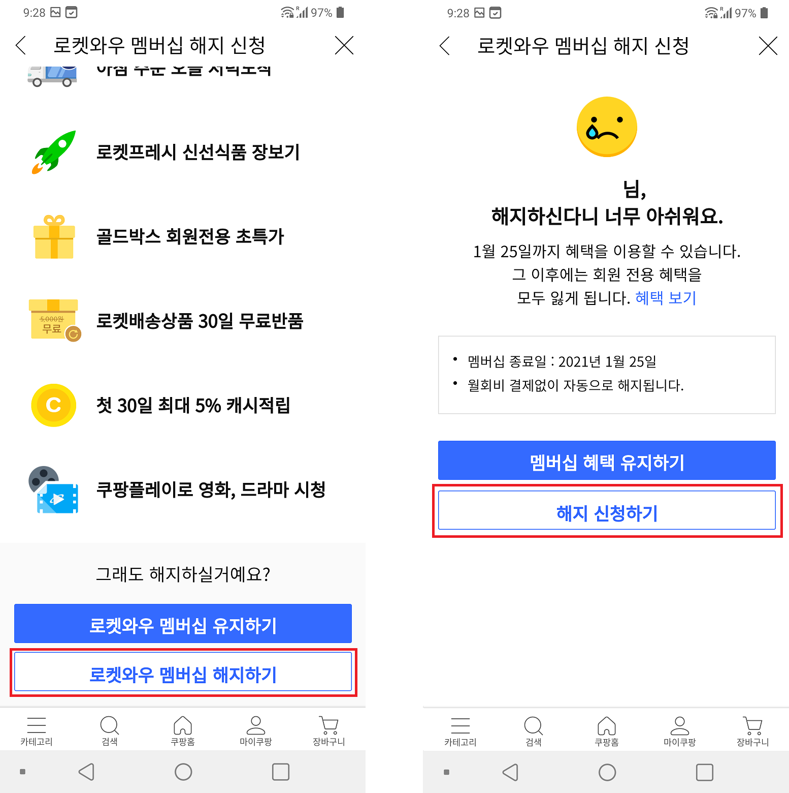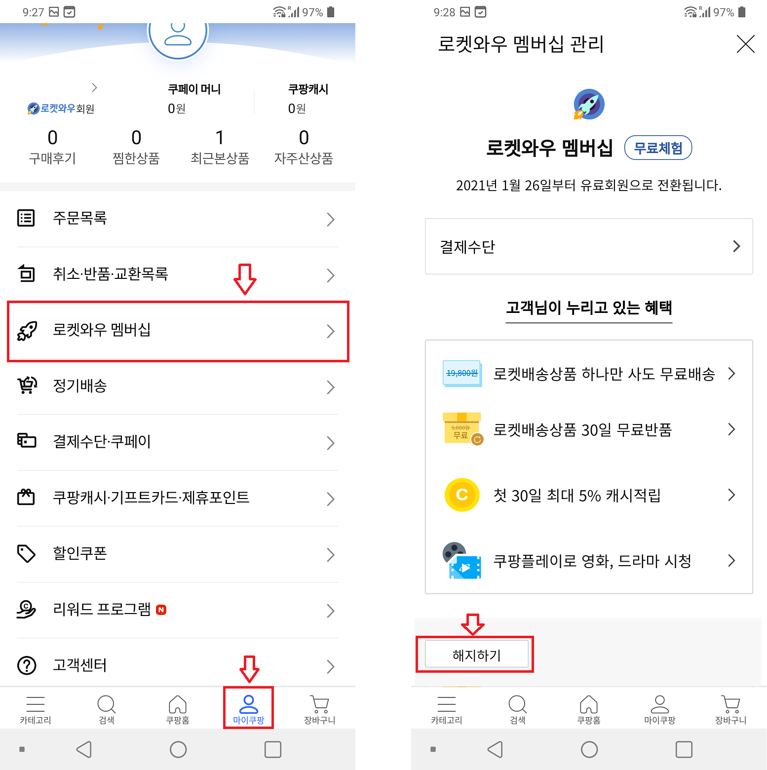 쿠팡플레이 해지하는 방법 ( 로켓와우 멤버십 해지하기)