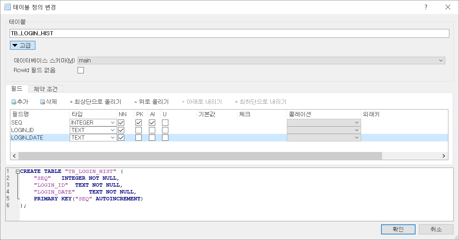 테이블 이름을 지정하고, 필드 탭에서 추가 버튼을 클릭하여 필드를 하나씩 추가합니다. 기본값 설정도 가능하며, 제약 조건 탭을 클릭하여 제약 조건 설정이 가능합니다. 데이터베이스에 대한 지식이 필요한 영역입니다.