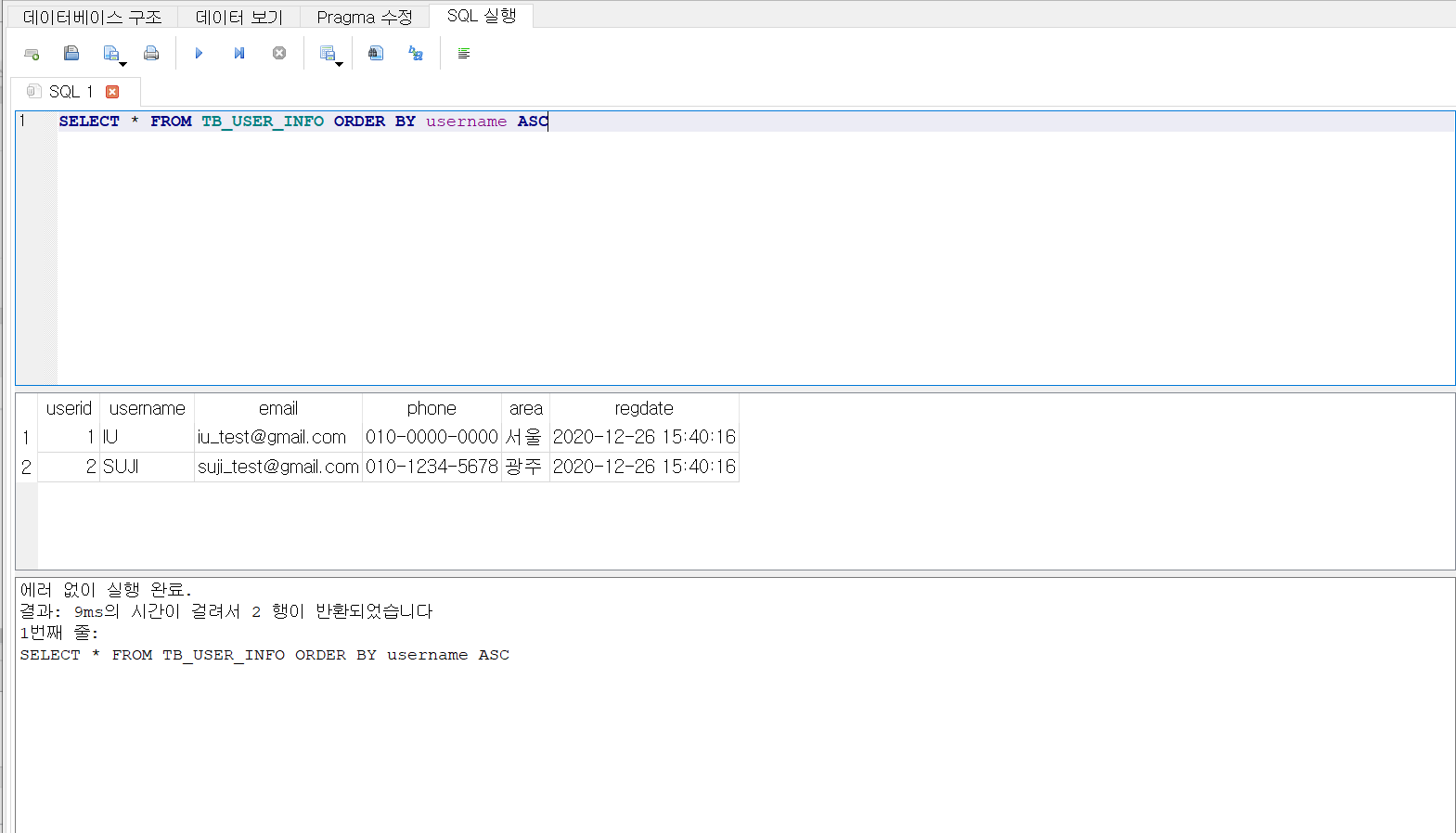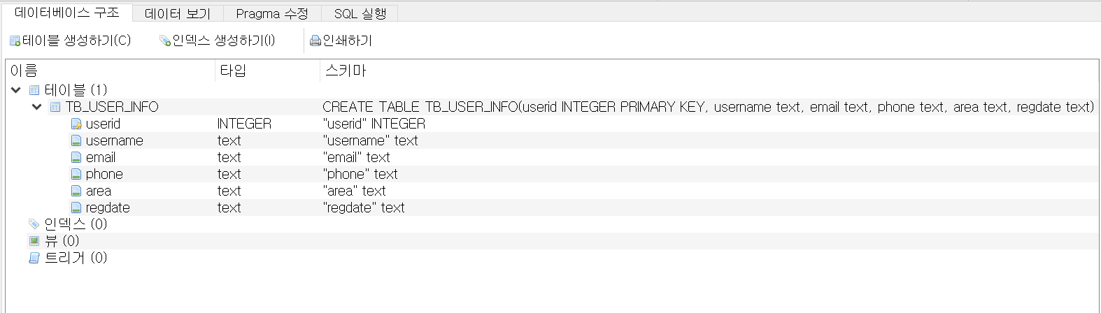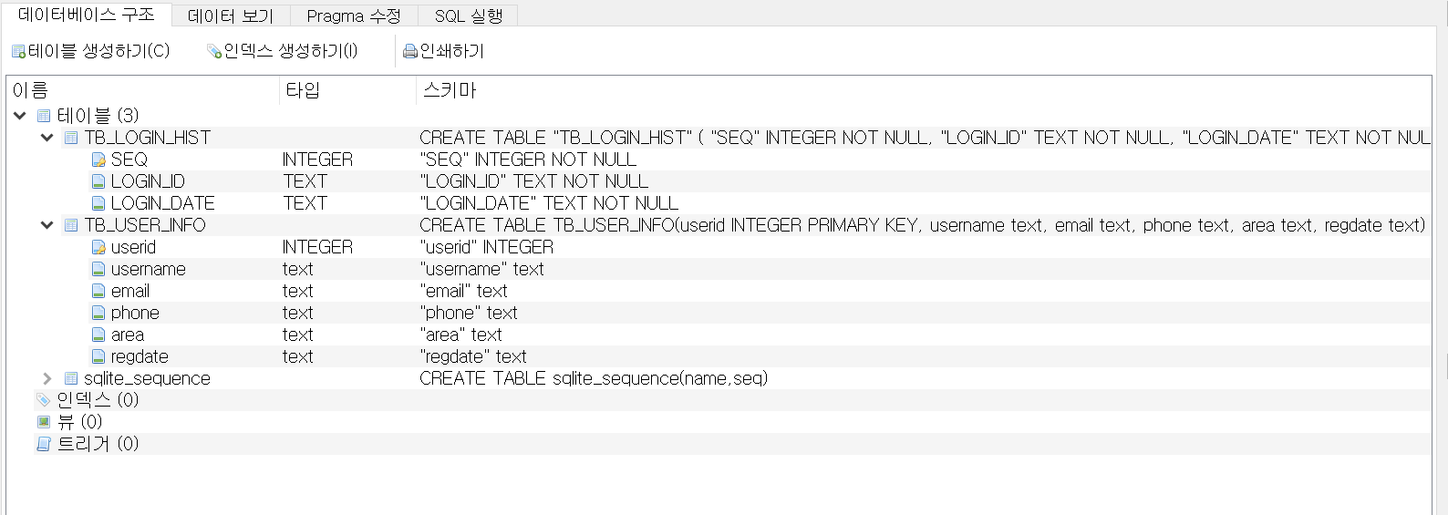 데이터베이스 구조 탭에서 만들어 놓은 테이블과 인덱스, 뷰, 트리거 등의 정보를 확인할 수 있습니다.