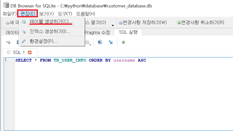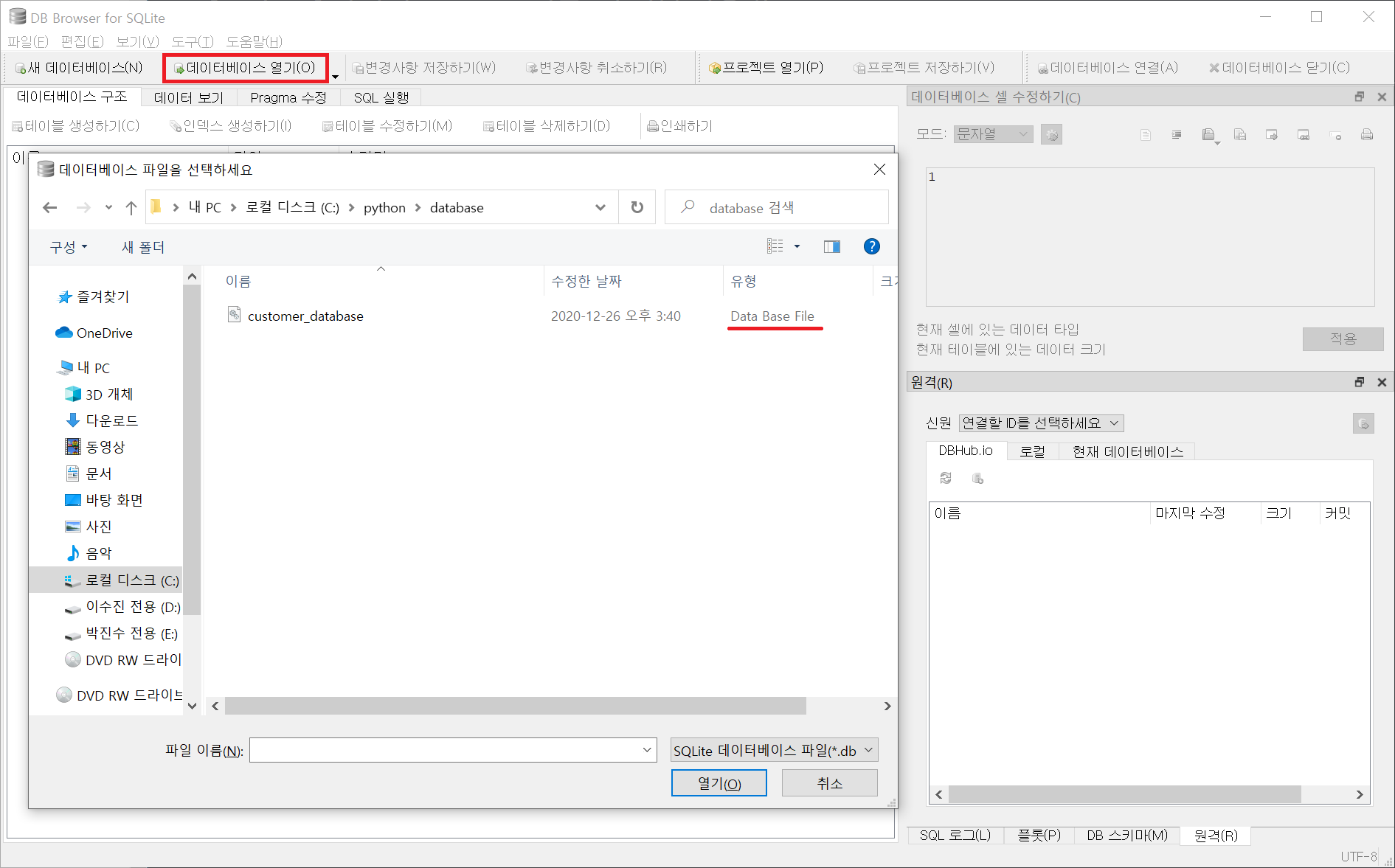 데이터베이스 열기를 클릭하여 기존에 만들어 놓은 db파일이 있으면 읽어옵니다.