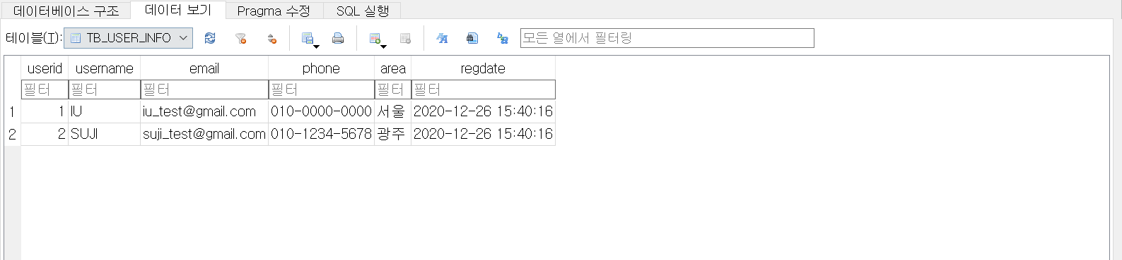 데이터 보기 탭을 클릭하면 현재 테이블에 데이터를 조회합니다.