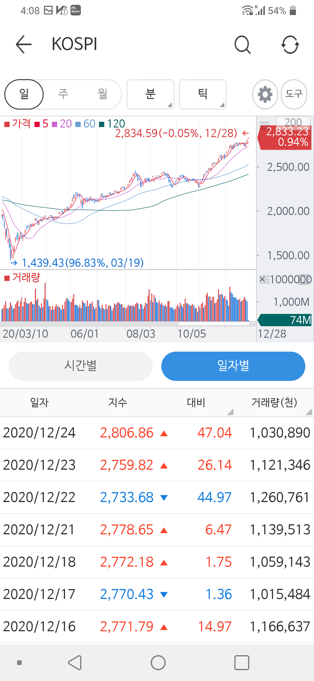2020년 12월 28일은 삼성전자 주가가 8만원을 돌파한 역사적인 날입니다. 80,100원을 터치 후 현재 동시호가는 79,400원입니다. 사상 최고가를 기록했어요. 종합주가지수는 코로나 바이러스 여파로 2020년 3월19일 1,439까지 내려간 후 9개월만에 사상최고치인 2,834.59를 기록하였습니다. 오늘은 배당락일입니다. 2020년 마지막 투자일입니다. 배당금을 받으려면 오늘 주식을 매수해야합니다.