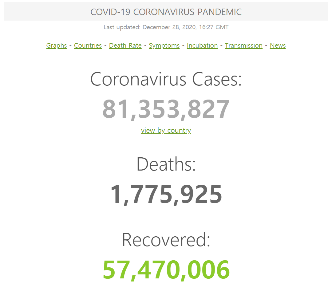2020년 12월 28일 기준으로 전 세계에서 코로나로 죽은 사람이 177만 5천명을 넘었습니다. 전 세계 누적 감염자 수는 8천 135만명에 달합니다. 코로나 바이러스가 얼마나 무서운 바이러스인지를 실감하게됩니다. 전쟁보다 무서운 바이러스입니다. 백신 접종을 한다고 해도 쉽게 종식될 질병이 아닌 것 같습니다. 백신을 접종했으니 안심하고 마스크를 벗고 다닐 수 있을까요? 전문가들에 의하면 독감 예방 접종처럼 정기적으로 예방접종을 해야할 수도 있다는 얘기도 전해집니다. 세계보건기구(WHO)는 신종 코로나바이러스가 절대로 사라질 수 없다고 경고하면서 에이즈 바이러스(HIV)와 같이 풍토병이 될 수도 있다고 보고 있어요. 제 3차 대유행으로 번지고 있는 지금, 전세계가 패닉상태임에도 마스크 착용 시비 관련해서 뉴스에 보도 되는것을 보면 참 안타깝습니다. 얼머나 심각한지를 모르는 사람들이겠죠? 영국발 변종 코로나 바이러스가 확산될 조짐을 보이고 있어요. 그 누구도 안전하지 못한 시대에 살고 있습니다.