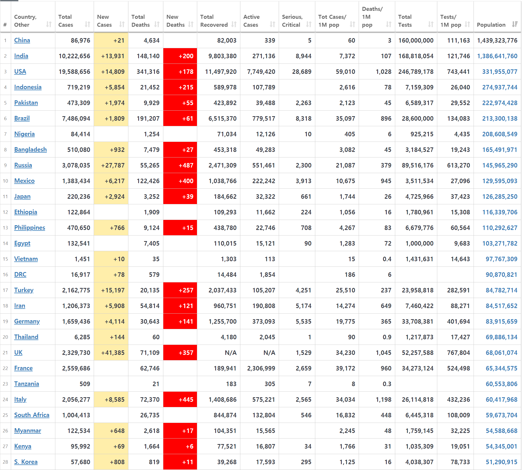 아래 도표는 인구수 기준으로 12월 28일자 코로나바이러스 현황을 조회한 자료입니다. 전세계에서 인구수가 가장 많은 중국에서 12월28일 하루 동안 코로나바이러스 확진자가 21명이라는게 믿기지 않네요. 인도는 하루에 1만3천명의 확진자가 속출하고 있고, 미국 역시 하루에 확진자가 1만 4천명을 넘었습니다. 러시아의 경우 하루만에 확진자가 2만7천명 넘게 나왔습니다. 터키 역시 하루에 1만 5천명의 확진자가 발생하고 있으며, UK의 경우 하루 확진자가 4만명을 넘었습니다. 한국은 전세계 인구 랭킹은 28위에 있으며, 하루 확진자 수가 드디어 천명 아래로 내려갔네요. 정말 다행입니다. 하루 하루 시간이 흐를 수록 확진자수가 감소했으면 하는 바램입니다.