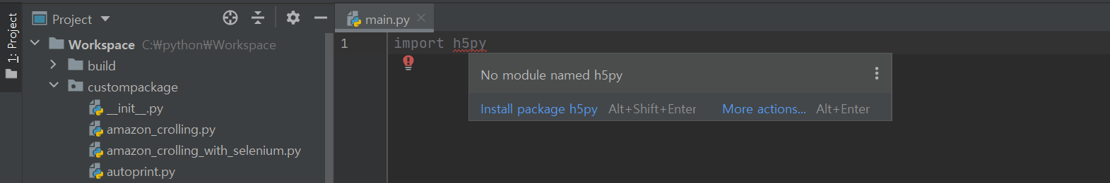 파이참 IDE를 사용중인 경우에는 마우스 커서를 올리면 install package h5py를 클릭하여 설치할 수 있습니다.