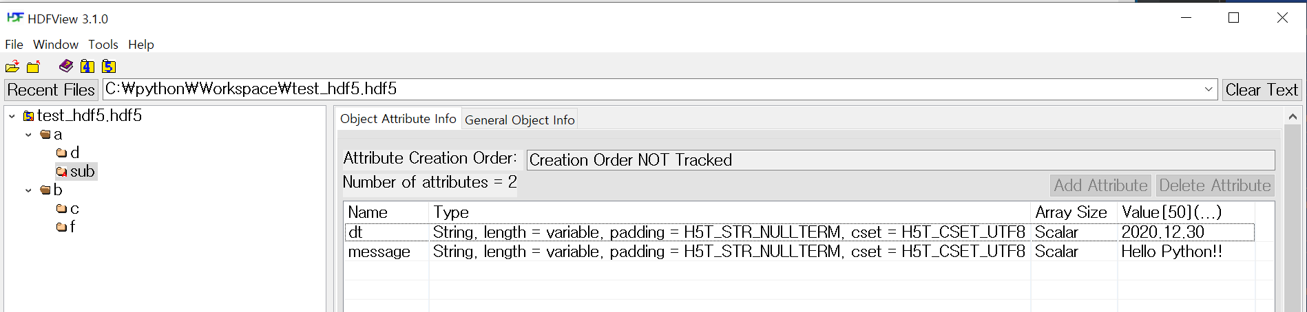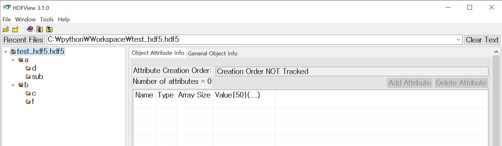 HDFVIEW 프로그램을 실행하여 속성까지 추가한 정보를 확인해봅니다.