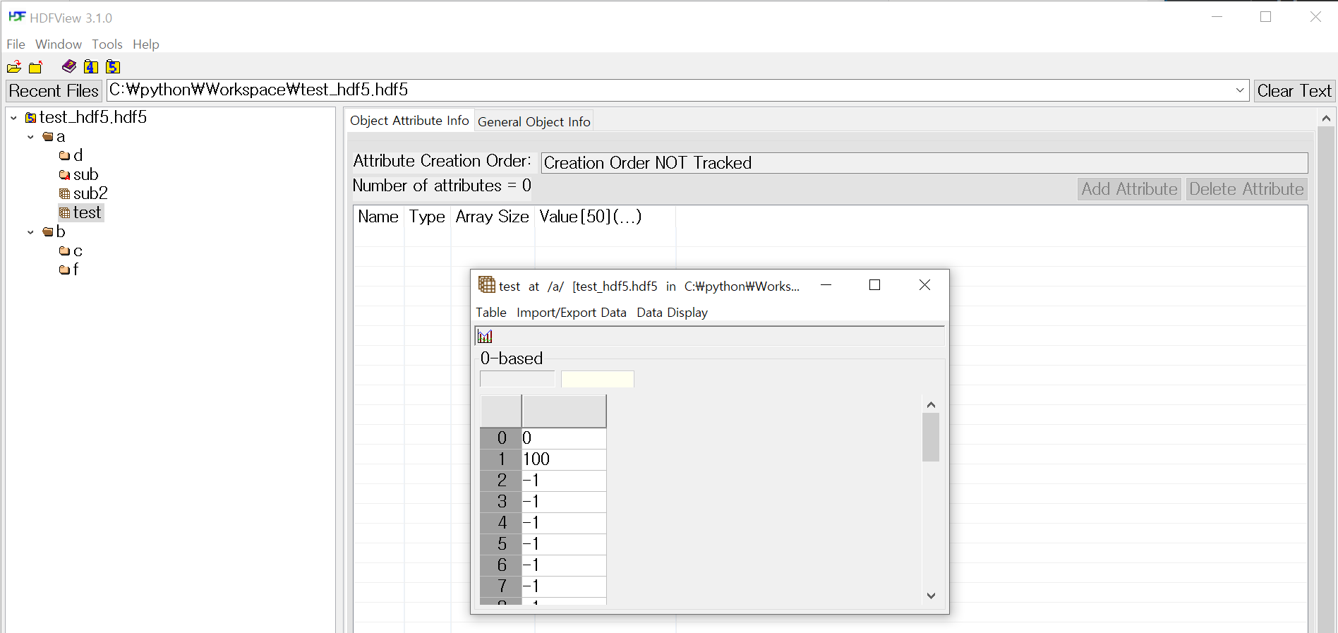 HDFVIEW 프로그램을 실행하여 그룹, 속성, 데이터 셋까지 추가된 정보를 확인해봅니다. 왼쪽의 디렉토리와 같은 구조에서 데이터 셋을 클릭하면 데이터를 확인할 수 있습니다.