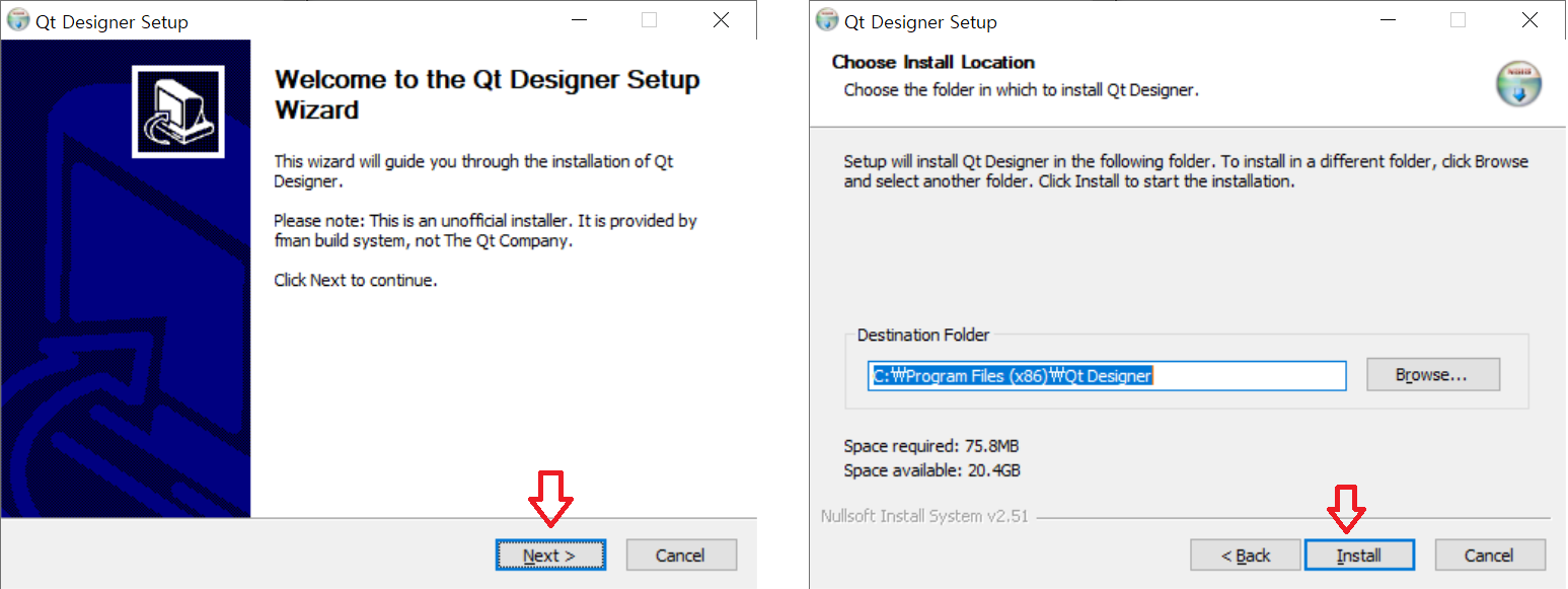 다운로드 받은 Qt Designer Setup.exe 파일을 클릭하여 설치를 시작합니다. Next 버튼 클릭 > Install 버튼 클릭