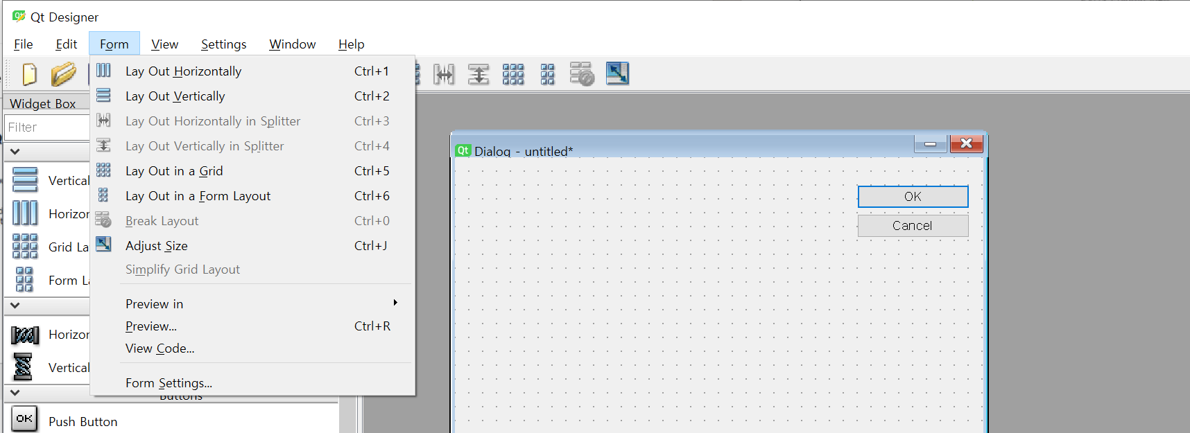 단축키 Ctrl+R을 누르거나 상단 메뉴 Form을 클릭 후 Preview…를 클릭하여 실행해볼 수 있습니다.