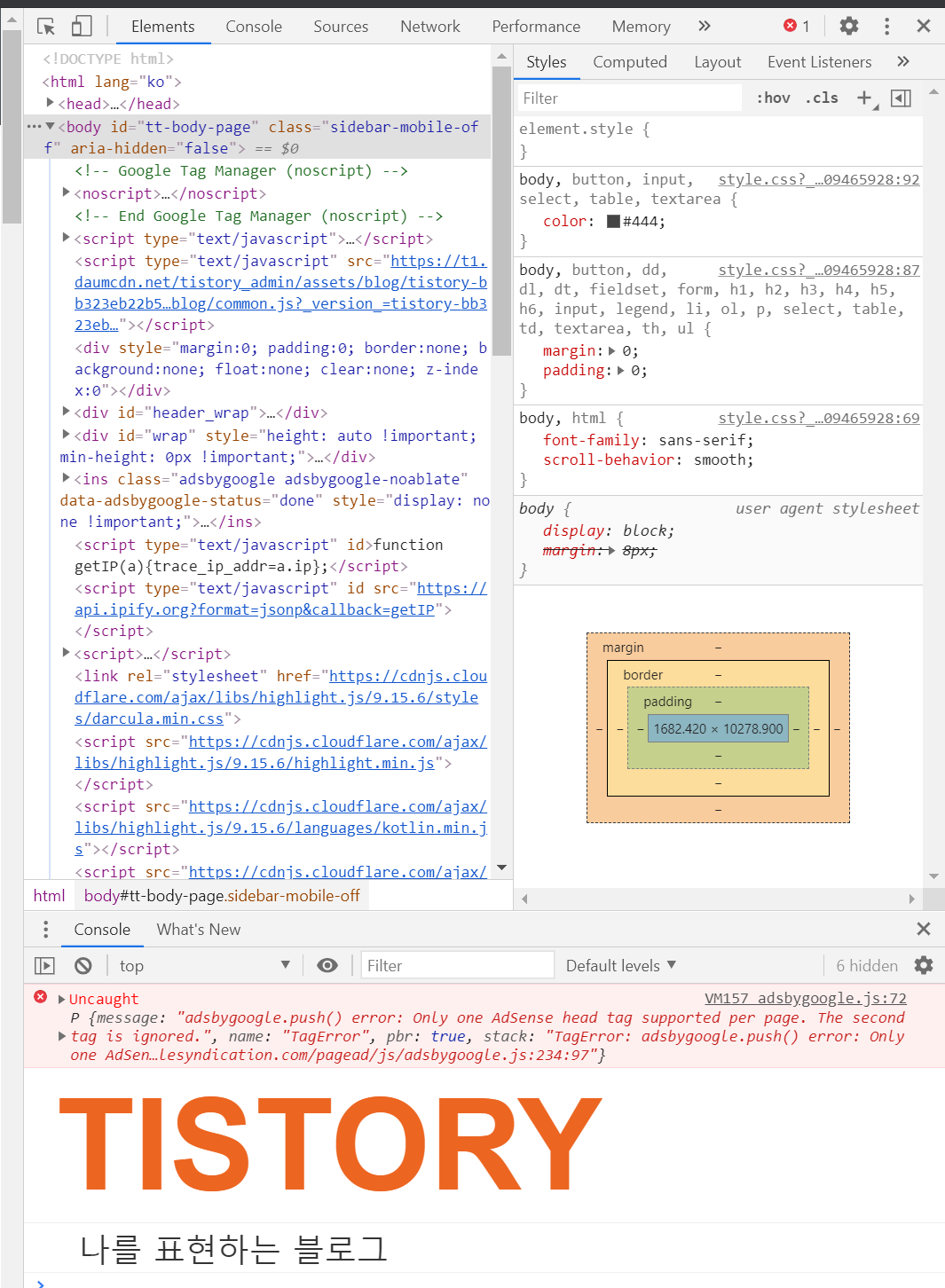 [티스토리]블로그 오류처리 adsbygoogle.push() error: Only one AdSense head tag supported per page. The second tag is ignored.