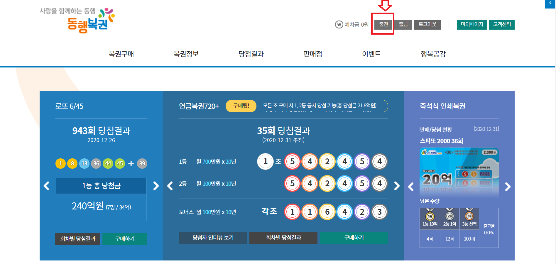 - 예치금이란 인터넷 복권을 구입하실 수 있도록 미리 충전해 둔 복권 구매용 결제수단입니다.