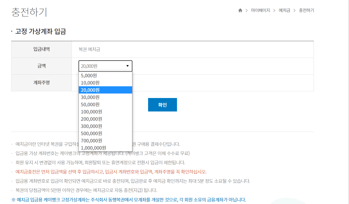 ※ 예치금 입금용 케이뱅크 고정가상계좌는 주식회사 동행복권에서 모계좌를 개설한 것으로, 각 회원 소유의 금융계좌가 아닙니다.