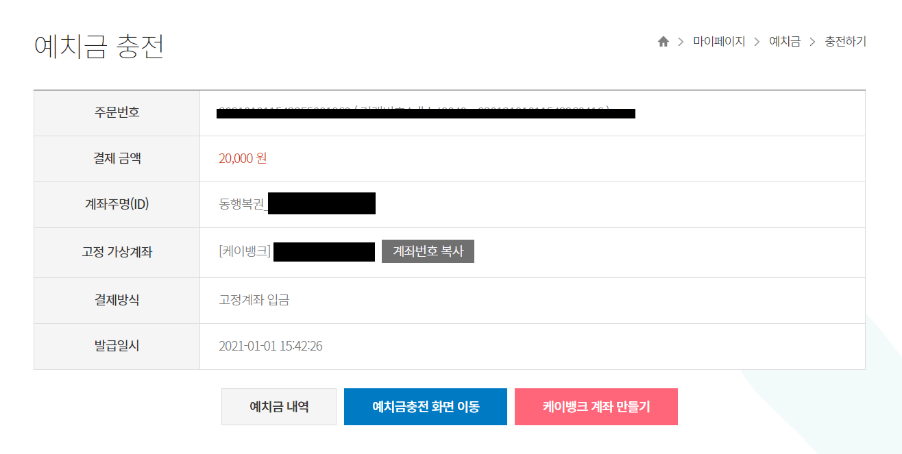 4. 고정 가상계좌에 입금하면 마무리됩니다. 고정 가상계좌가 안보인다면 아래쪽에 케이뱅크 계좌 만들기 버튼을 클릭하여 계좌를 먼저 생성하세요.