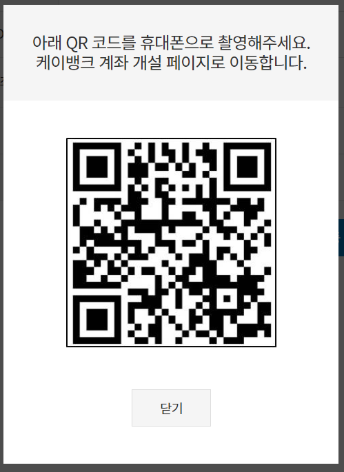 케이뱅크 계좌 만들기 버튼을 클릭하면 QR코드가 나타납니다.