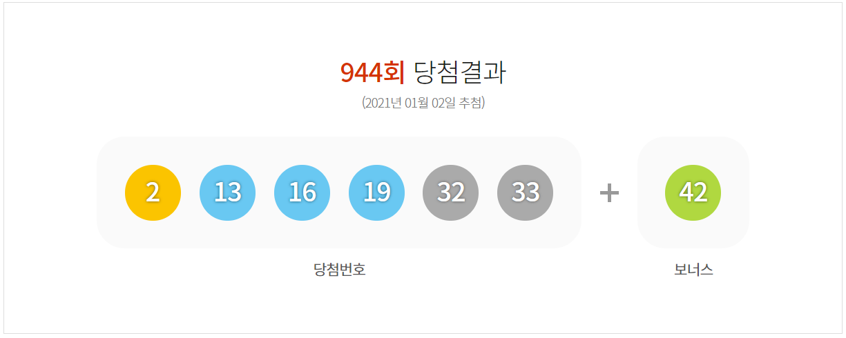 1회차 부터 944회차 까지 역대 당첨번호 리스트입니다. 로또 회차별(1회~944회) 당첨번호 회차 추첨일 당첨번호 보너스번호 1등 당첨자수 당첨금액 944 2021.01.02 2, 13, 16, 19, 32, 33 42 13 1,961,836,356원..