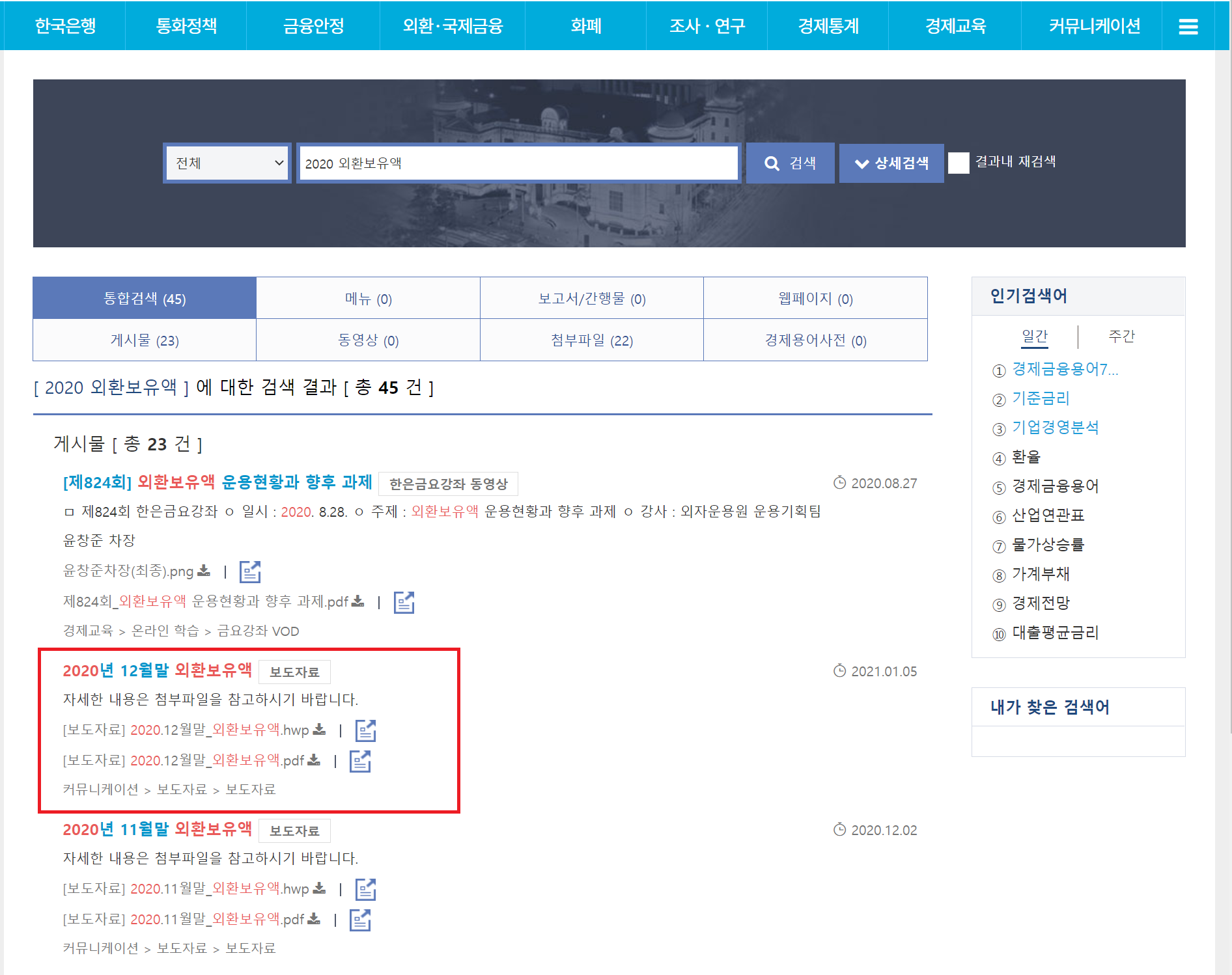오른쪽 상단 검색창에 원하는 년도의 외환보유액을 검색합니다. 2020 외환보유액“을 타이핑 후 검색 버튼을 클릭합니다.