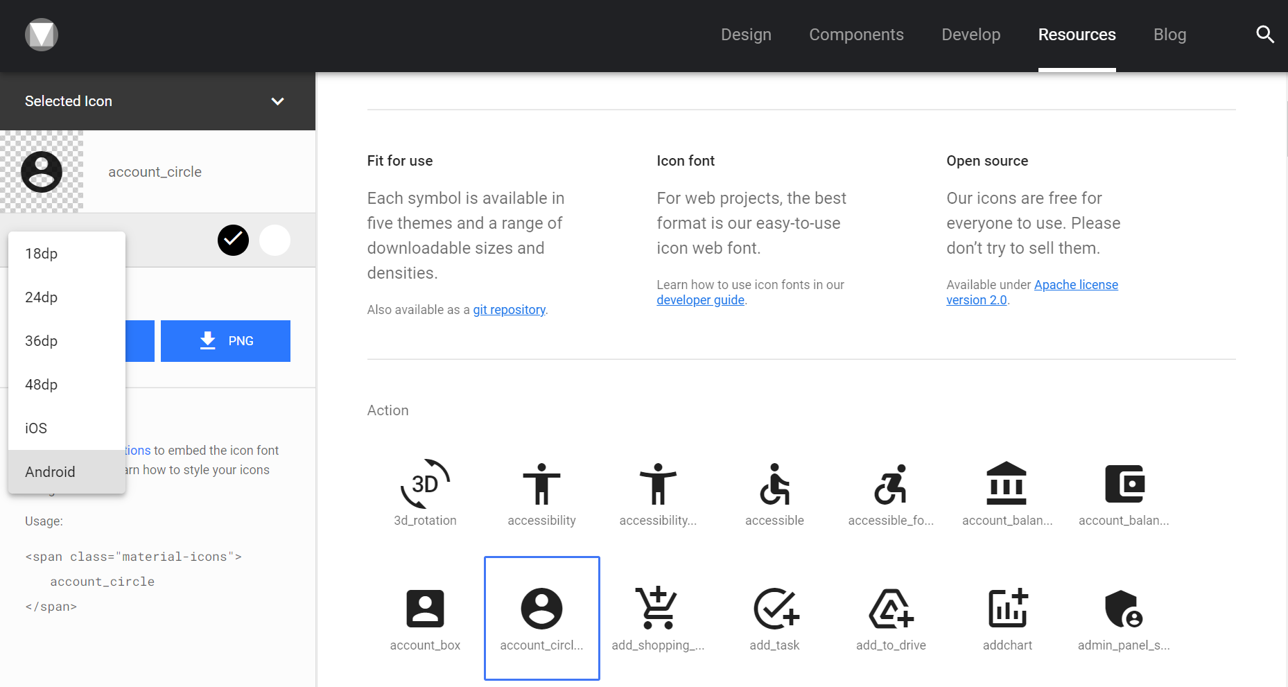 첫번째 방법은 머티리얼(material.io/resources/icons/?style=baseline) 사이트에서 다운받아서 사용하는 방법입니다. 5가지 테마로 제공되고 있으며 , 원하는 아이콘을 클릭시 SVG와 PNG파일로 다운받을 수 있습니다. 또 한 IOS나 Android 를 선택하는 경우 모든 관련 파일을 모두 다운받을 수 있습니다.