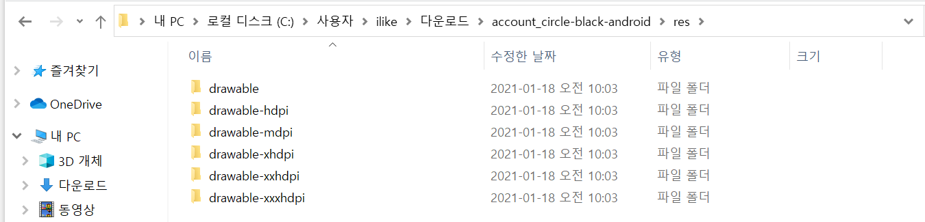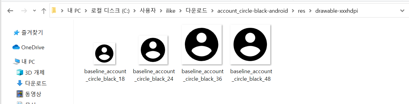 Android를 선택한 후 PNG 다운로드한 경우 기기 해상도별로 18, 24, 36, 48사이즈로 4개씩 제공되고 있으며, drawable 폴더에는 svg파일을 벡터이미지로 변환할 필요 없도록 벡터이미지를 제공합니다.