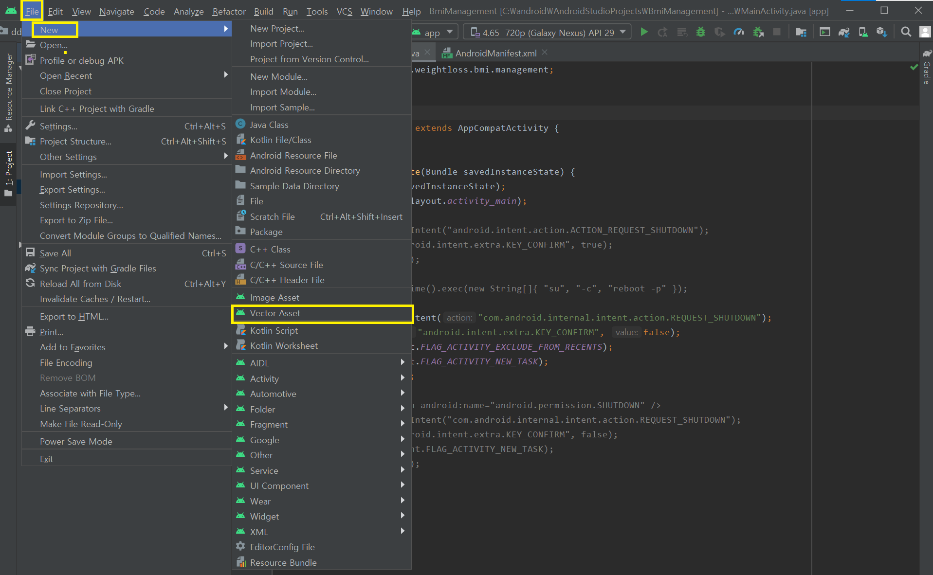 안드로이드 스튜디오 툴을 실행 후 상단 메뉴에서 File > New > Vector Asset 클릭합니다.