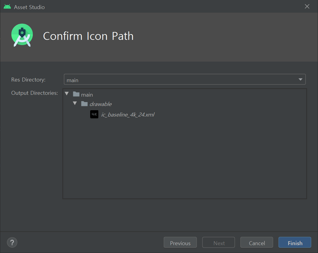 drawable 폴더에 벡터이미지가 추가됨을 알려줍니다. 벡터이미지는 drawable 폴더에 들어가며, drawable-mdpi, drawable-hdpi, drawable-xhdpi, drawable-xxhpdi, drawable-xxxhdpi 폴더에 추가하지 않습니다. Finish버튼을 클릭하여 마무리합니다.