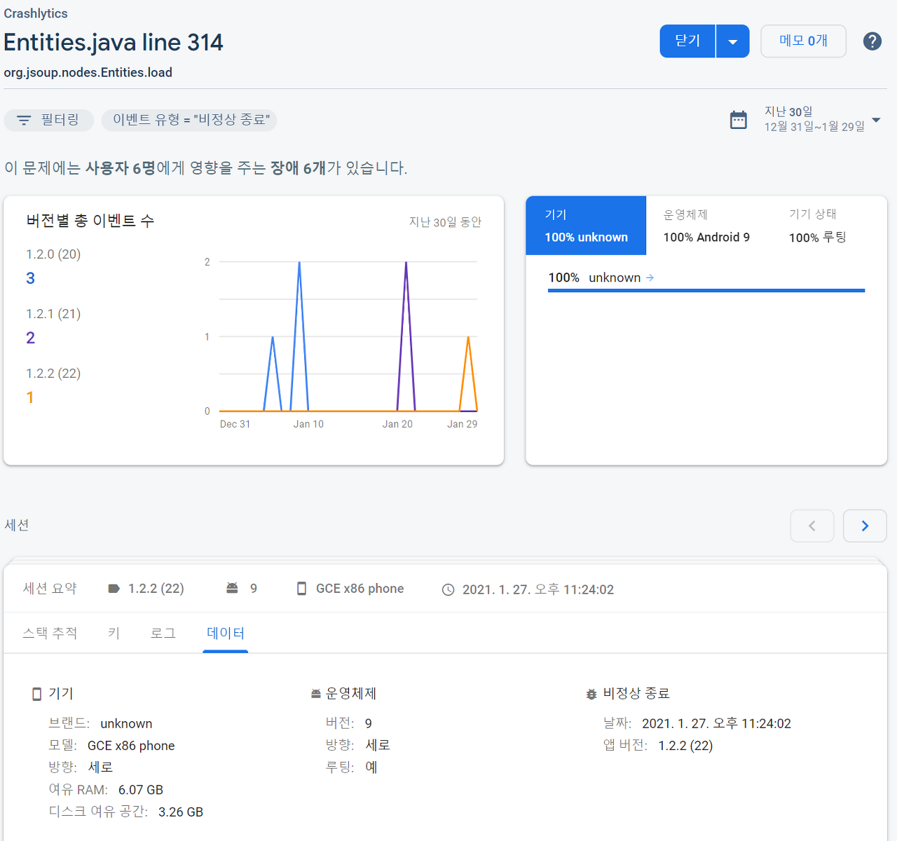 org.jsoup.nodes.Entities.load 하는 과정 중에 Entities.java line 314에서 오류가 발생하였다. 6번의 오류 보고가 있었고 모든 동일한 사람으로 부터 발생한 오류였다. 확인결과 알 수 없는 제조사의 GCE x86 phone 이며, 운영체제는 Android 9이고 루팅된 폰이다. 루팅된 폰에서는 앱을 사용할 수 없도록 루팅폰 체크 로직을 추가하였으나 통과한 케이스이다.
