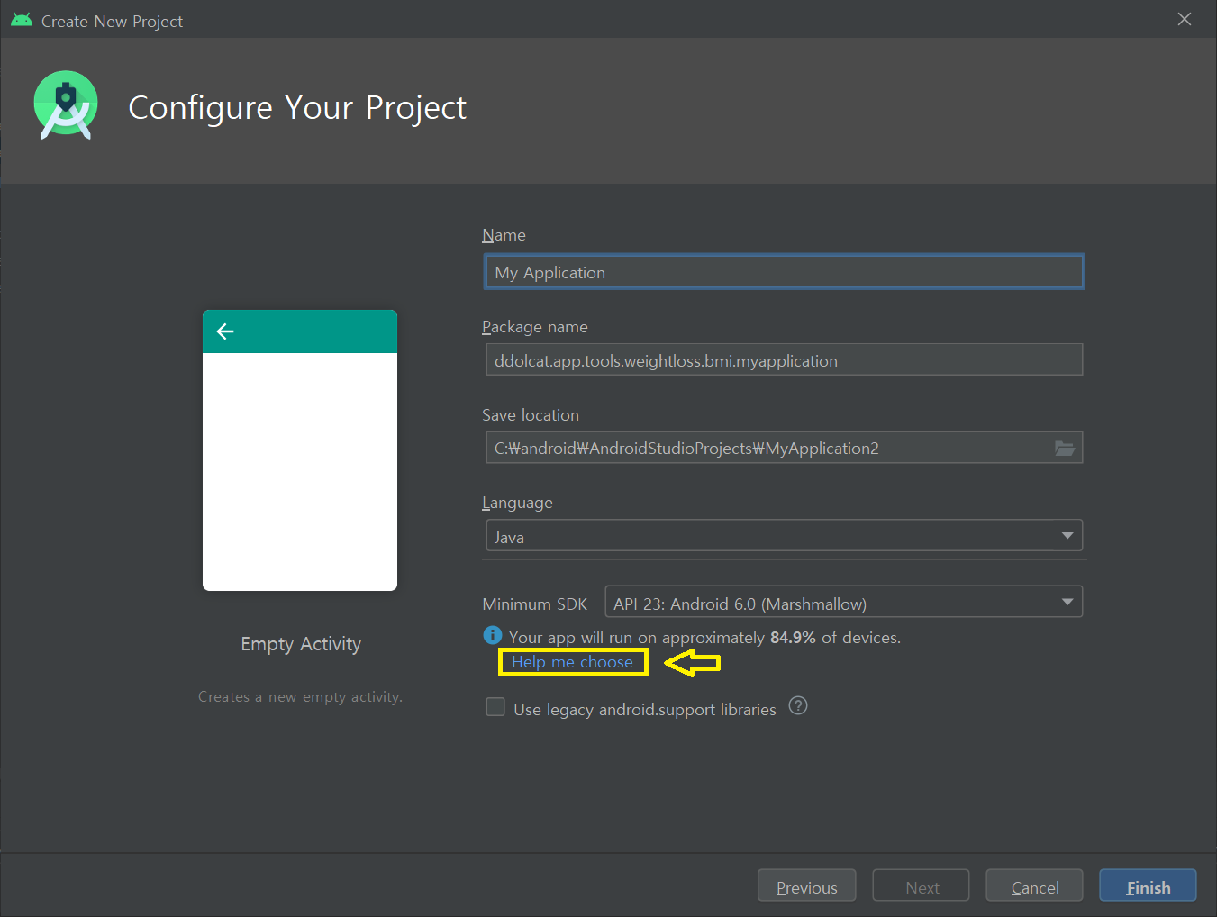안드로이드 스튜디오에서 새로운 프로젝트 생성시, Minimum SDK를 선택해야합니다. 이때 전세계 사용자들이 API버전별로 얼마나 사용되고 있는지 확인할 수 있습니다. Android Studio의 메뉴를 클릭하여 프로젝트 생성시 File > New > New Project… 메뉴를 순서대로 클릭 후 프로젝트 템플릿을 선택(Select a Project Template)합니다. 그런 다음 Next 버튼을 클릭하면 프로젝트 구성 팝업창이 나타납니다. 프로젝트 설정정보 팝업창에서 Help me choose 파란색 글씨를 클릭하면 점유율 확인이 가능합니다.
