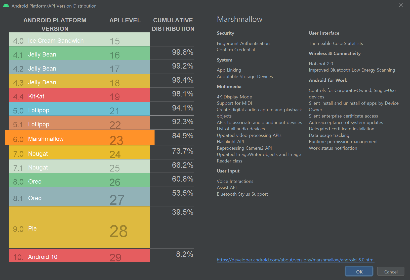 안드로이드 버전별 점유율을 확인해보면 누적 분포 비율로 제공됩니다. 안드로이드 10 (29)의 점유율이 8.2%를 기록하였습니다. 안드로이드 9 파이(28)는 31.3%의 점유율을 기록중이며, 안드로이드 8.1 오레오 27 버전의 경우 14%, 안드로이드 8.0 오레오 26은 7.3% 점유율을 기록하였습니다. 안드로이드 7.1 누가(25)는 5.4%, 안드로이드 7.0 누가 24는 7.5%, 안드로이드 6.0 마시멜로우(23)는 11.2%, 안드로이드 롤리팝(22)은 7.4%, 롤리팝(21)은 1.8%, 안드로이드 4.4 키켓(19)은 4%, 안드로이드 4.3 젤리빈(18)은 0.3%, 안드로이드 4.2 젤리빈(17)은 0.8%, 안드로이드 4.1 젤리빈(16)은 0.6%의 점유율을 기록하였으며, 안드로이드 4.0 샌드위치(15)는 0.2%의 점유율을 기록하였습니다. 가장 큰 점유율을 기록한 운영체제(os)는 안드로이드 9(파이) 버전이며 그 다음으로 안드로이드 6.0 마시멜로우(23)가 2위를 차지했습니다. 즉 사용자층을 많이 확보하기 위해서는 최소 SDK버전을 16으로 잡아야합니다. 아이스크림 샌드위치는 버립시다!! 버전별로 처리해야할 권한 처리 문제가 발생하기는 하지만 사용자층 확보를 위해서라면 그런 수고는 감내해야합니다.