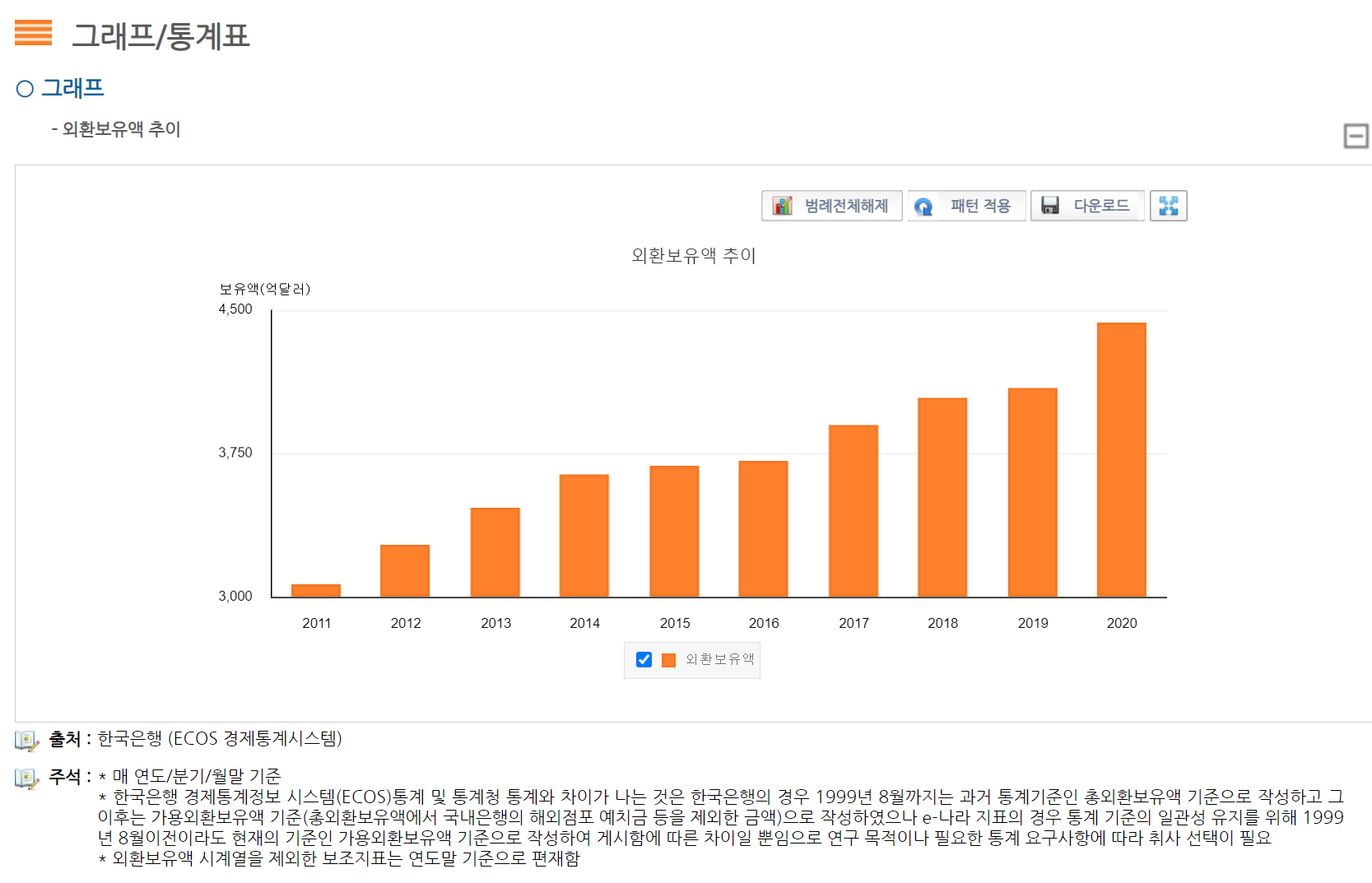 e-나라지표에서 제공하는 외환 보유액 추이 그래프입니다.