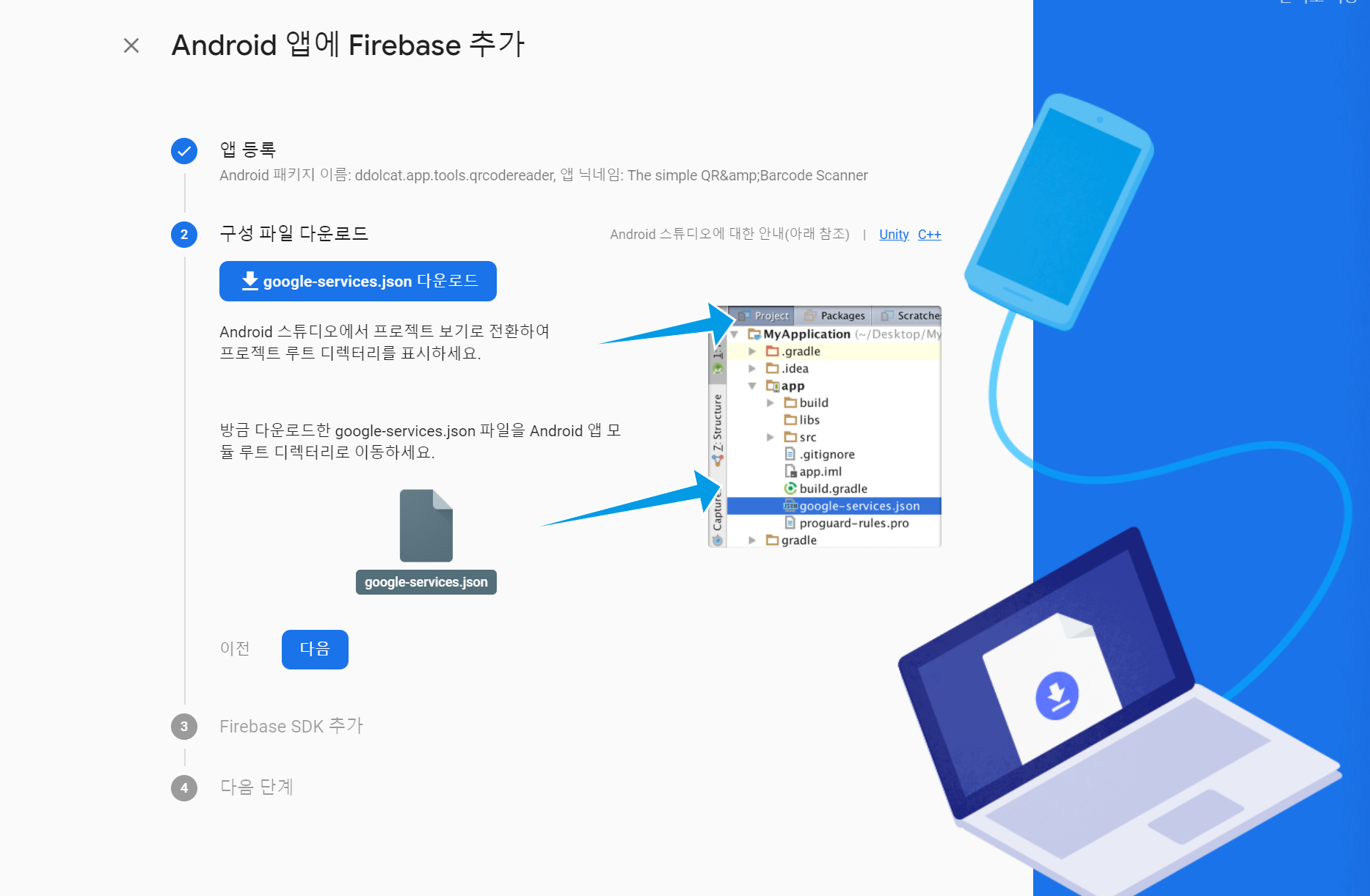 파이어베이스(Firebase)에 새로운 프로젝트를 추가후 Android앱을 추가하게되면 아래와 같이 가이드를 따라서 google-services.json파일을 다운 받은 후 Android 스튜디오에서 프로젝트 보기로 전환하여 프로젝트 루트 디렉토리(app) 폴더에 google-services.json 파일을 복사한 후 Firebase SDK를 추가하는 작업을 하게된다.