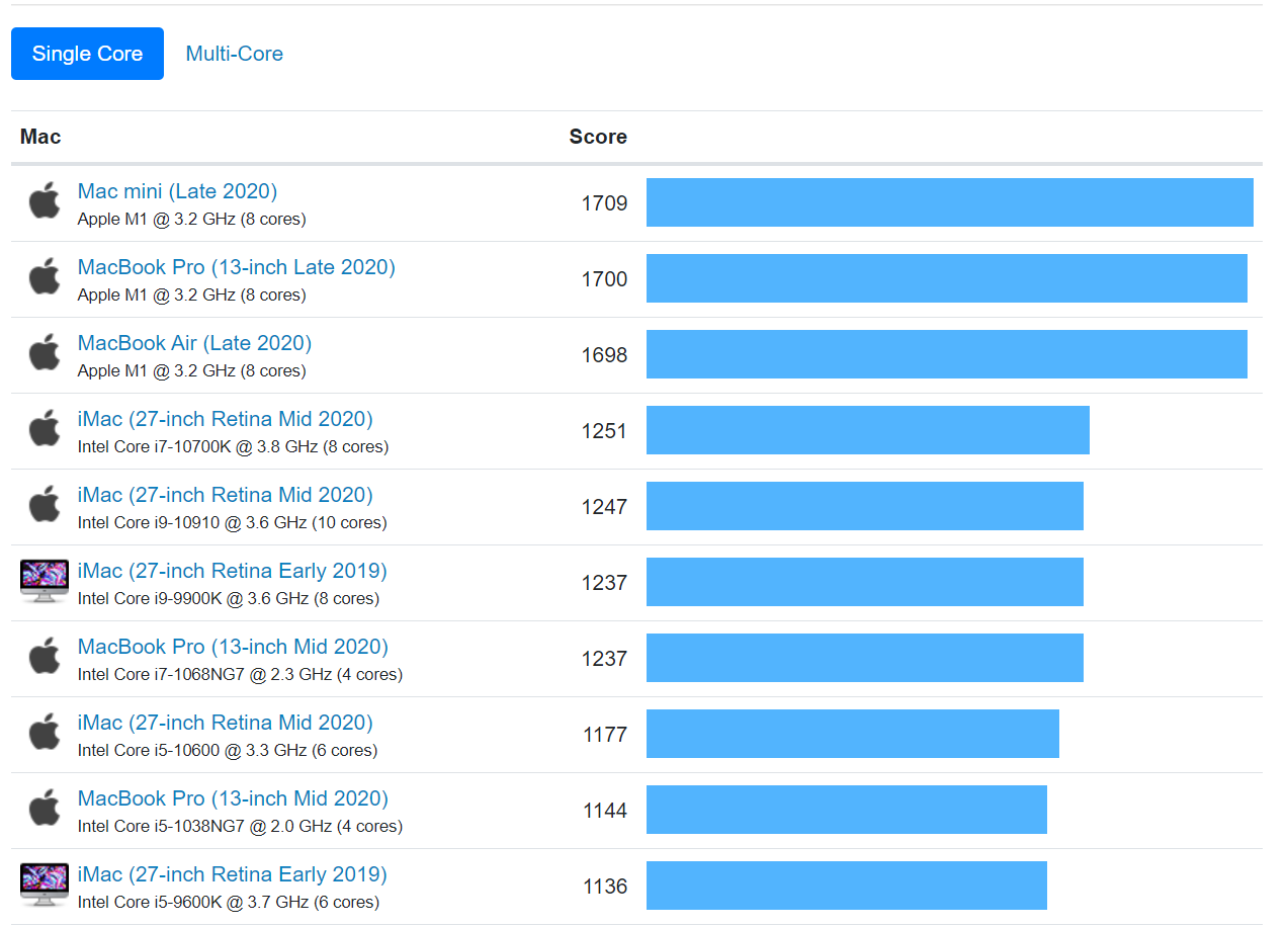 | 4 | iMac (27-inch Retina Mid 2020) | Intel Core i7-10700K @ 3.8 GHz (8 cores) | 1251 |