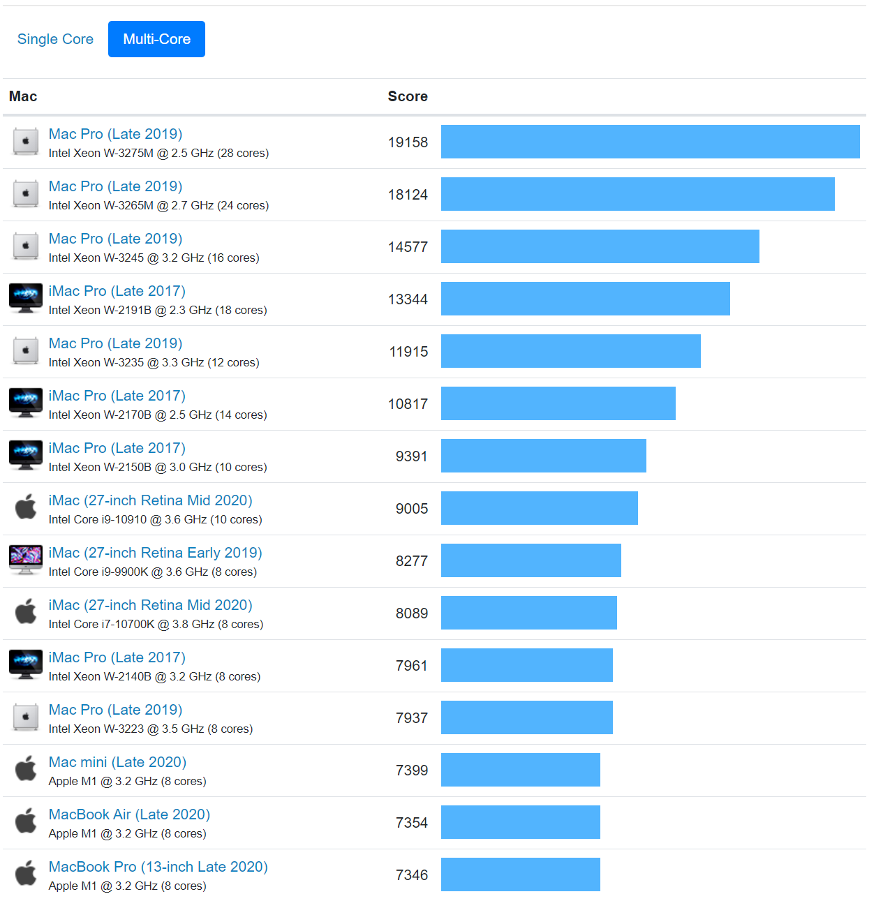 | 14 | iMac (27-inch Retina Mid 2020) | Intel Core i5-10500 @ 3.1 GHz (6 cores) | 1120 |