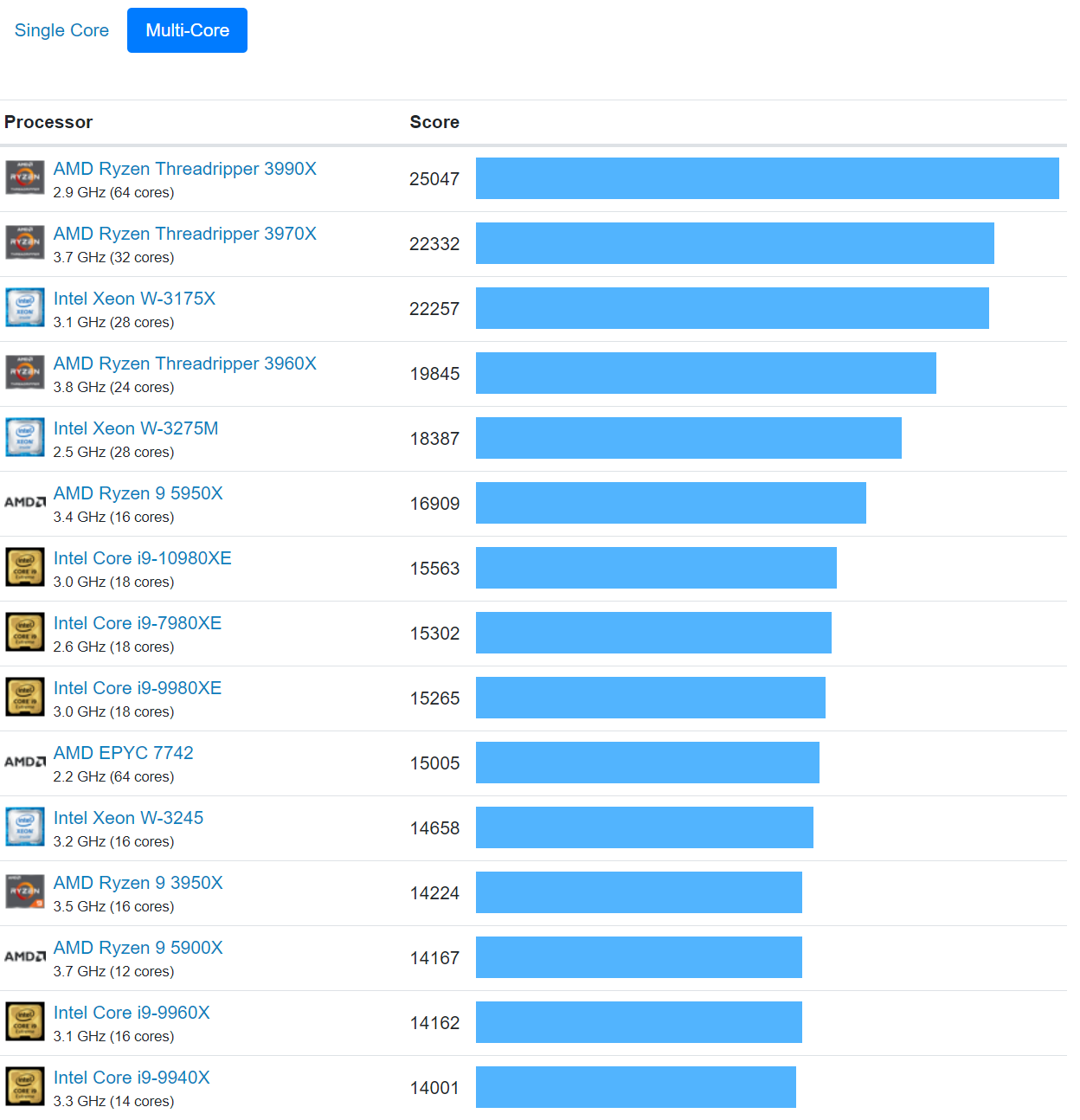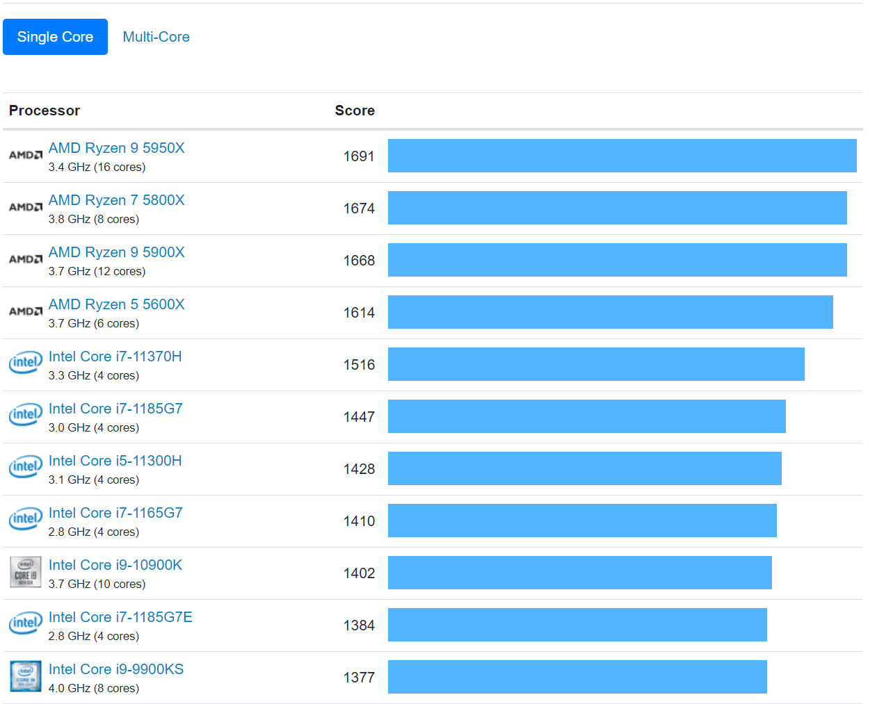 다음 데이터는 Geekbench Browser의 데이터를 토대로 작성되었습니다. 점수가 높을 수록 더 좋고, 점수가 두 두배이면 두 배의 성과를 나타냅니다. 싱글코어 기준으로 AMD사의 라이젠 5, 라이젠7, 라이젠9 제품이 랭킹 1위부터 4위에 올랐습니다. 인텔 시피유는 5위부터 14위까지 휩쓸었네요. 멀티코어 기준은 싱글코어 기준 순위표 뒤에 나오는 멀티코어 기준 순위표를 참고하세요.
