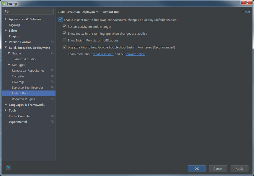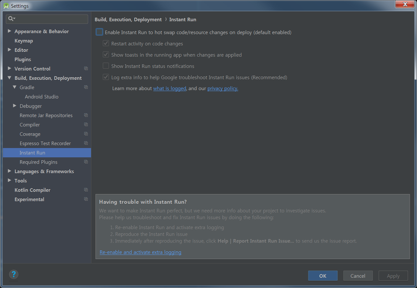 2.Build,Execution, Deployment – Instant Run 메뉴를 클릭한다.