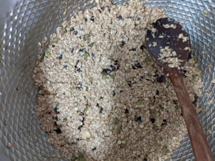 사과 4개 + 꿀을 적당량의 물을 넣고 믹서기로 갈아서 모든 재료를 섞은 후 손으로 반죽했습니다. 그리고 20분간 그대로 두었습니다. 그렇게 하면 오트밀에 잘 흡수 된다고 합니다. 20분간 그대로 두는 동안 오븐을 190도(화씨 370도)에 맞추고 예열했습니다. 크랜베리 대신 건포도 말린 것 넣어도 맛있을 것 같습니다.