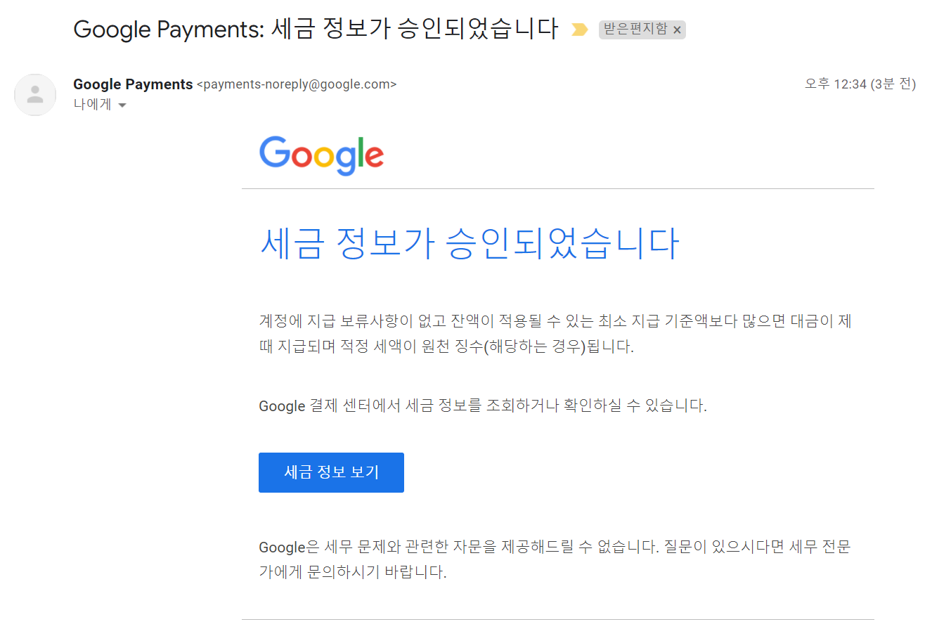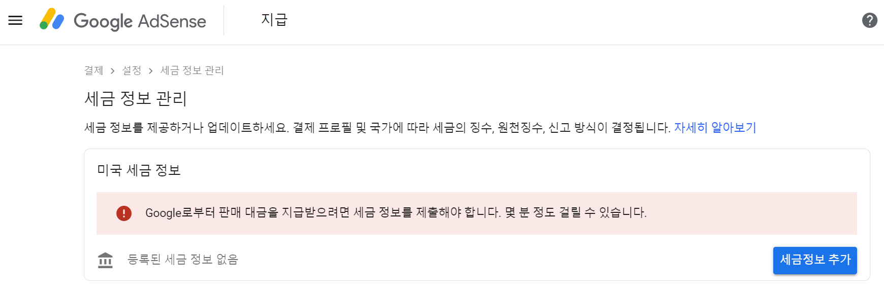 애드센스 계정에서 세금 정보를 확인하시기 바랍니다.
