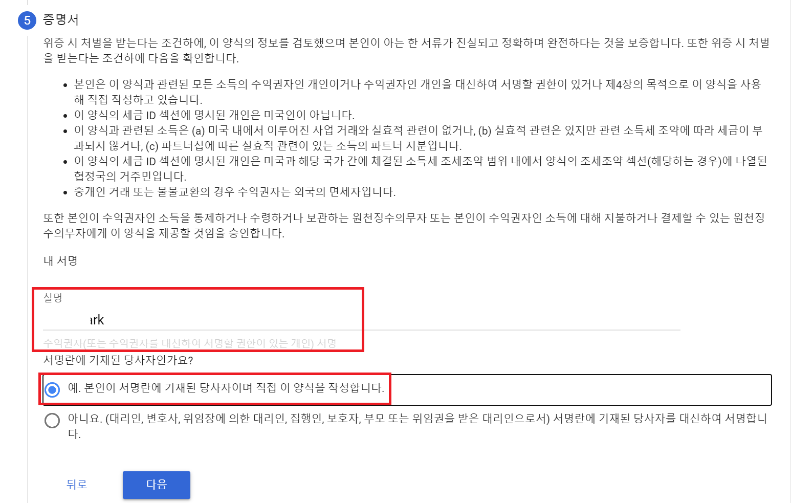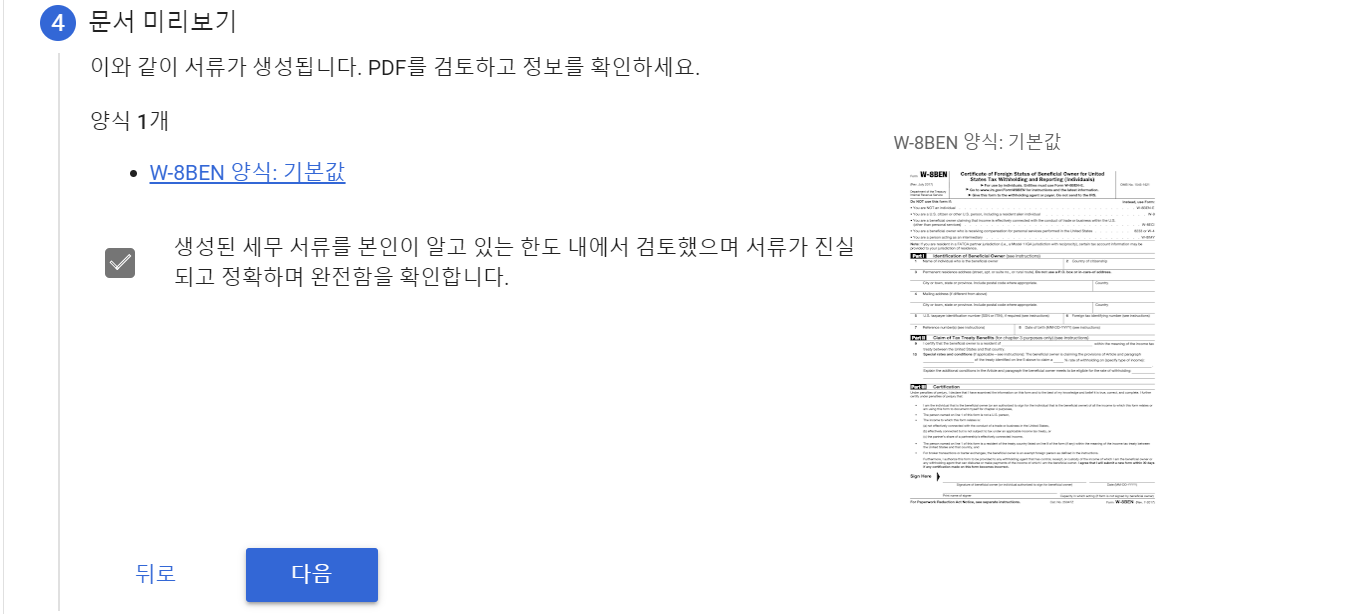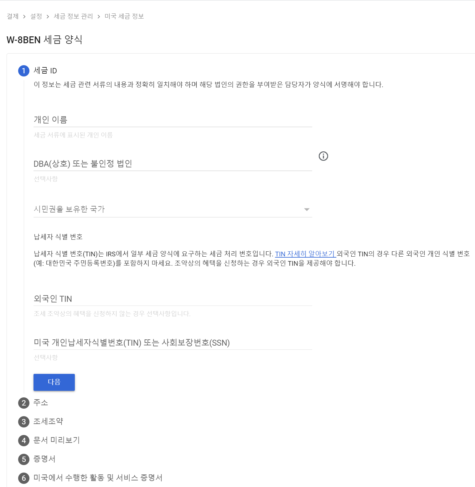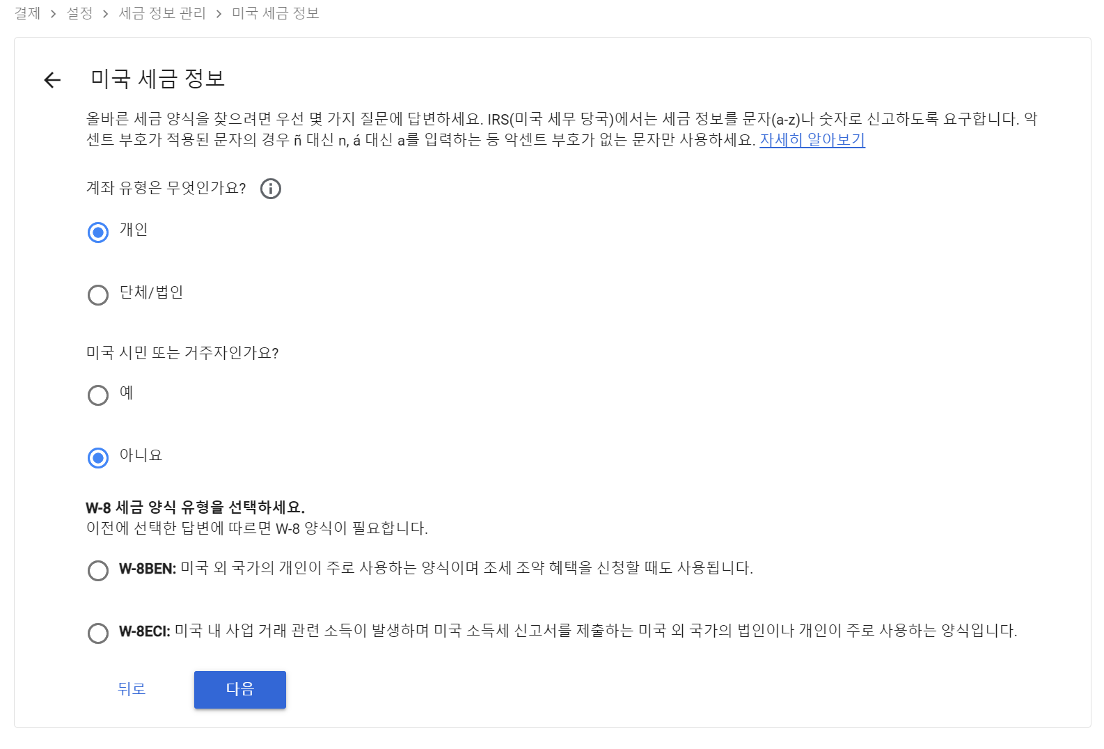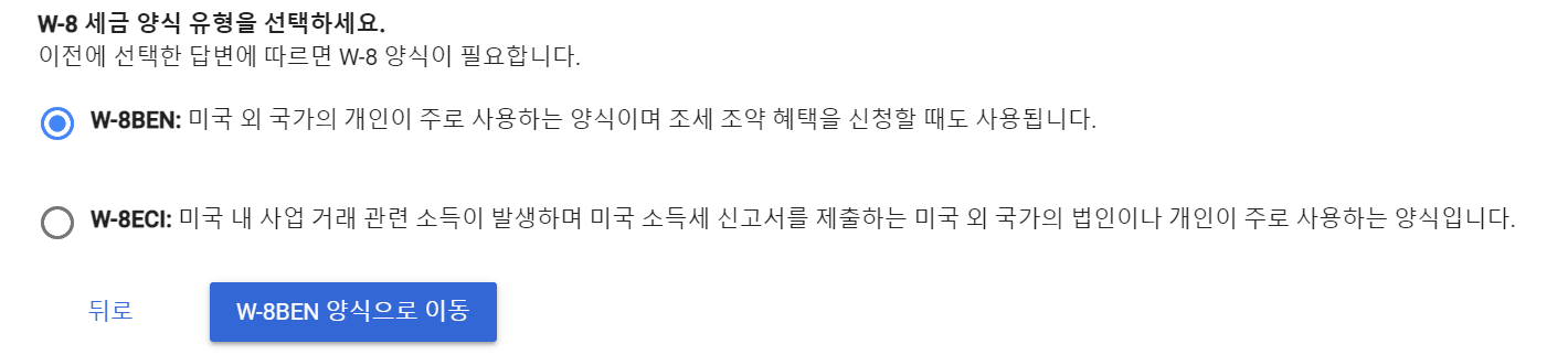개인 사업자 등록번호가 없는 경우 “W-8 세금 양식 유형을 선택하세요.”에 대한 답으로 W-8BEN를 선택했어요.