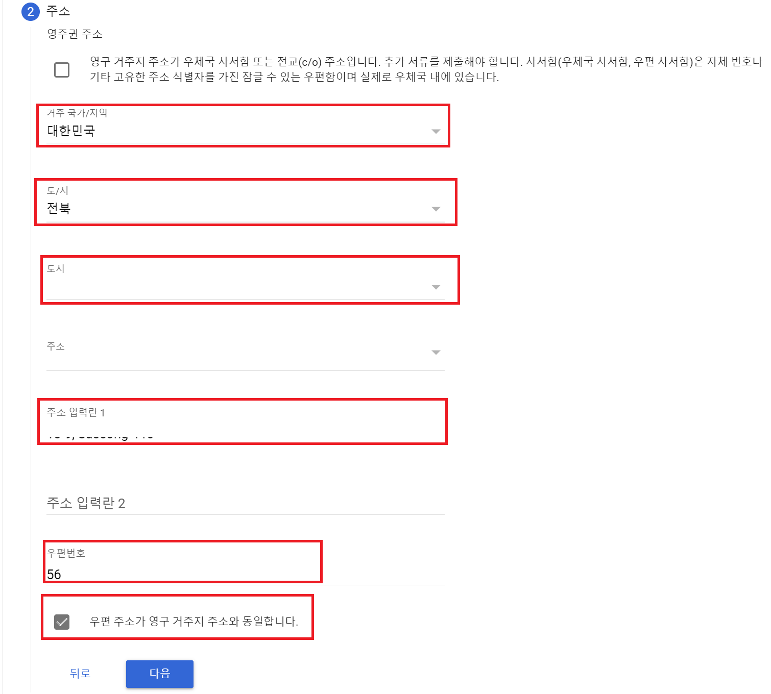 주소 입력란1과 주소 입력란2는 한글 주소가 아닌