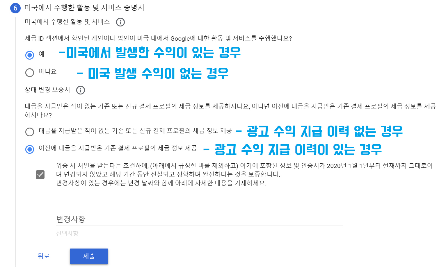 한번이라도 구글로 부터 광고 수익을 지급 받은적이 있다면 아래쪽 "이전에 대금을 지금받은 기존 결제 프로필의 세금정보 제공"을 선택합니다.