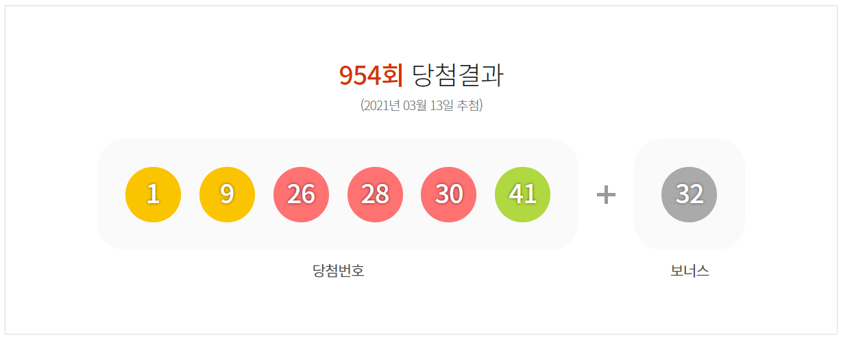 954회 로또 추첨번호는 1,9,26,28,30,41 입니다. 보너스 번호는 32입니다.