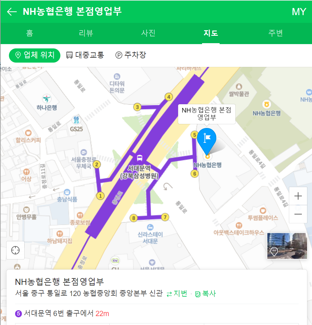 농협은행 본점 주소 : 서울 중구 통일로 120 농협중앙회(m.place.naver.com/place/33211288/location?subtab=location)