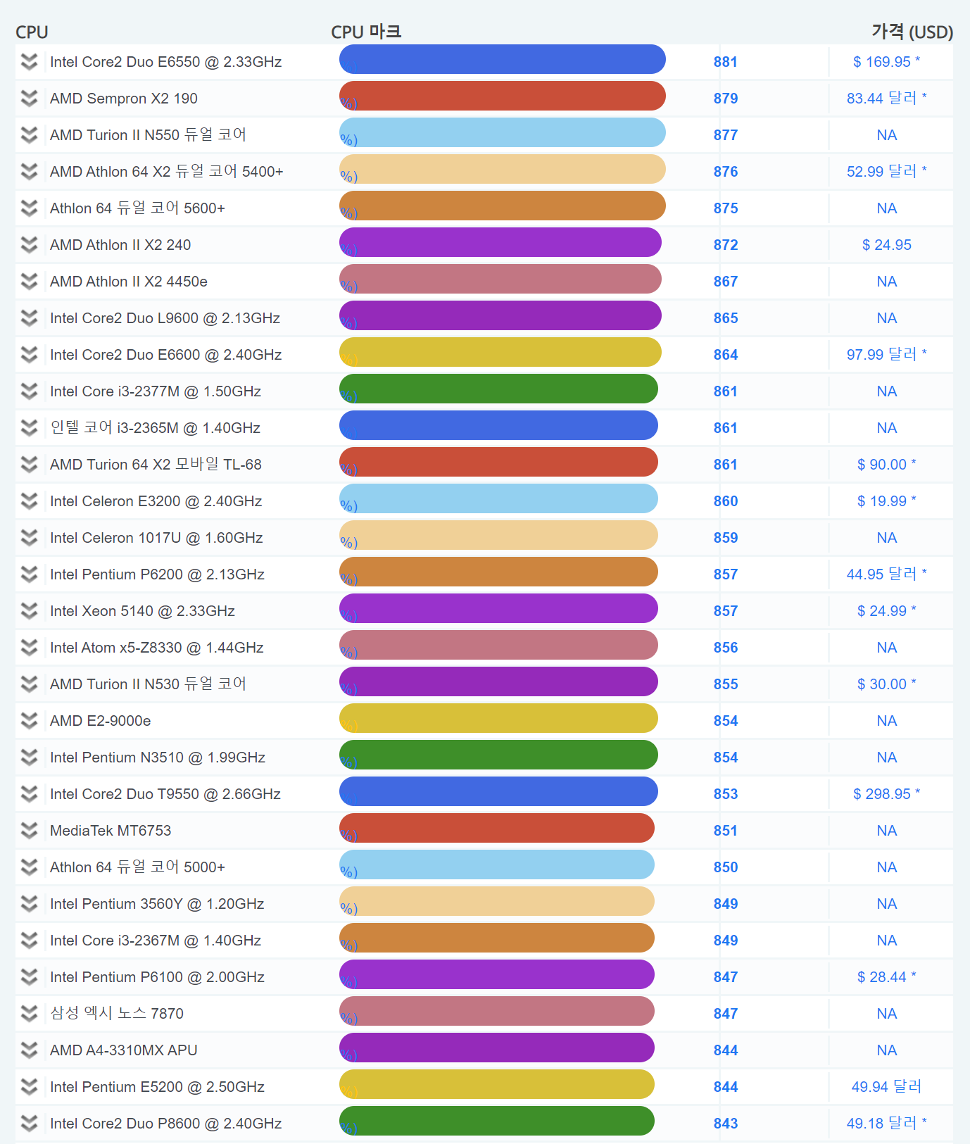 | 1 | 인텔 Core2 Duo E6550 @ 2.33GHz | 881 |