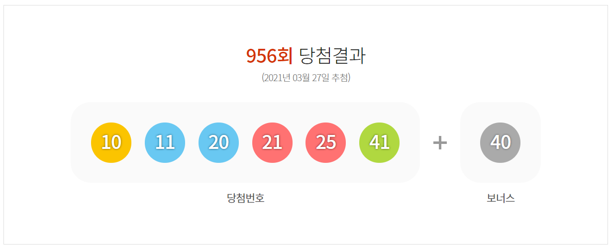 956회 로또 추첨번호는 10,11,20,21,25,41 입니다. 보너스 번호는 40입니다. 이번 회차에는 로또 2등 당첨자가 136명입니다. 부산 부일카서비스에서 2등 당첨자 수가 4명이 나왔고, 서울 은평구 무지개 복권방에서도 2등 당첨자 수가 4명이 나왔습니다.
