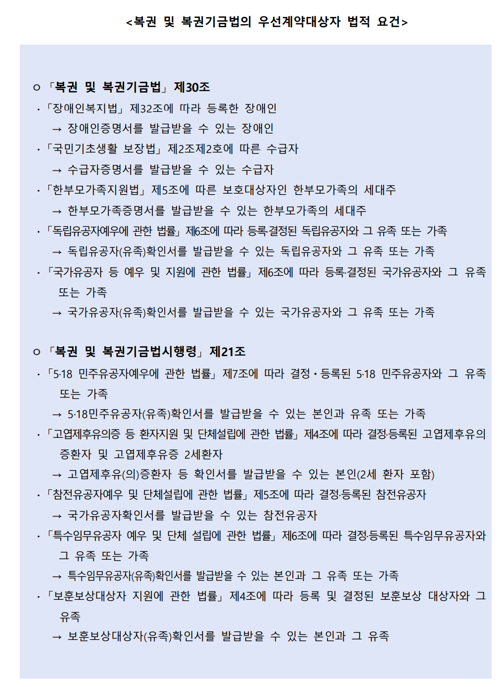 1) (우선계약대상자) 「복권 및 복권기금법」 제30조와 같은법 시행령 제21조에 의한 우선계약대상자로 국가기관에 등록·결정되어 관련 증빙서류를 발급받을 수 있는 분