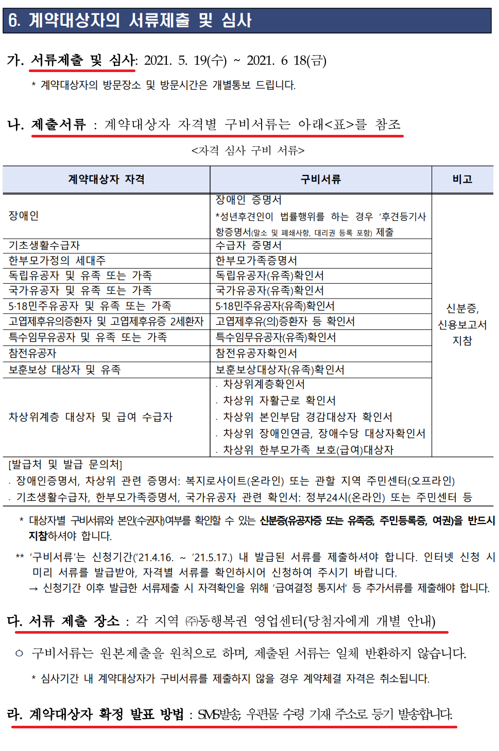 ㅇ 신청단계에서 기재사항 누락, 연락 불능, 자격요건 미비 등으로 인해 계약자격이 상실될 경우 불이익은 신청자의 책임이므로 상세 내용을 반드시 확인해야 합니다.