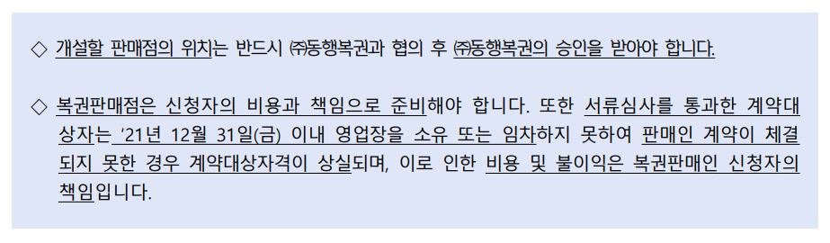 ㅇ 계약대상자는 2021년 12월 31일(금) 18시까지 복권판매가 가능한 영업장을 소유하거나 임차(임대차계약서 구비)하여 ㈜동행복권과 판매장비 설치와 계 약체결을 완료하셔야 합니다.